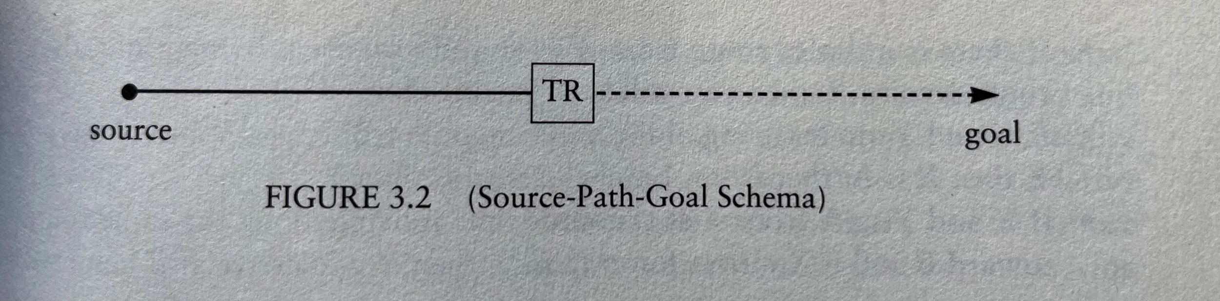 (c) ‘Trajector-landmark structure’ is given most clearly in the basic image schema of source-path-goal, visualized as a line with a dot on one end (the source or point of origin) and an arrow at the other (the goal or pointing to the goal). The conceptualization ‘to’ profiles (i.e. highlights) the goal, while ‘from’ profiles the source. (ibid)