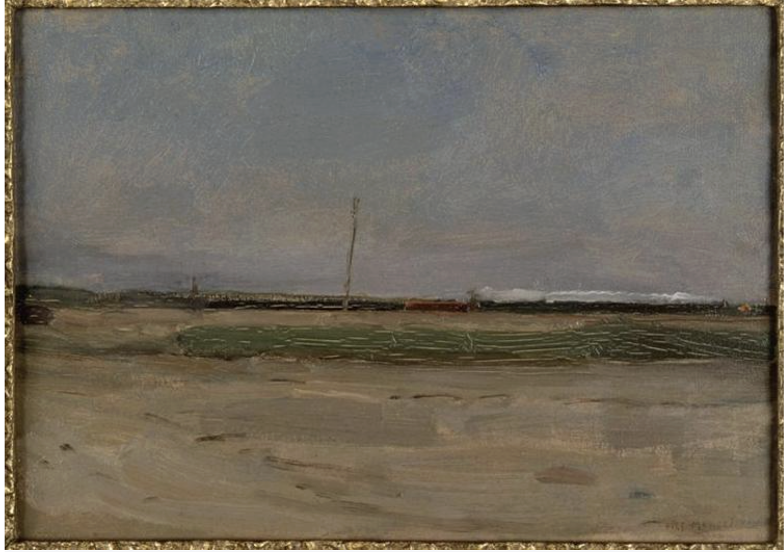where the spatial depth of the landscape is given by the scale of the depicted train and windmill, through View from the Dunes with Beach and Piers, Domburg (1909)