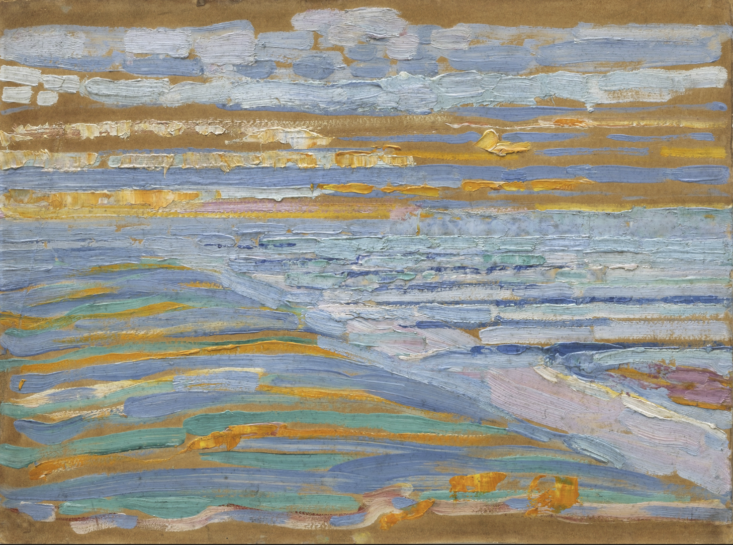 with the effect of mass given through juxtapositions of broad planes and the slightly convex line marking the meeting point of the dunes and the tide-swollen sea, to Pier and Ocean 5 (Sea and Starry Sky) (1915; mis-titled in the text)