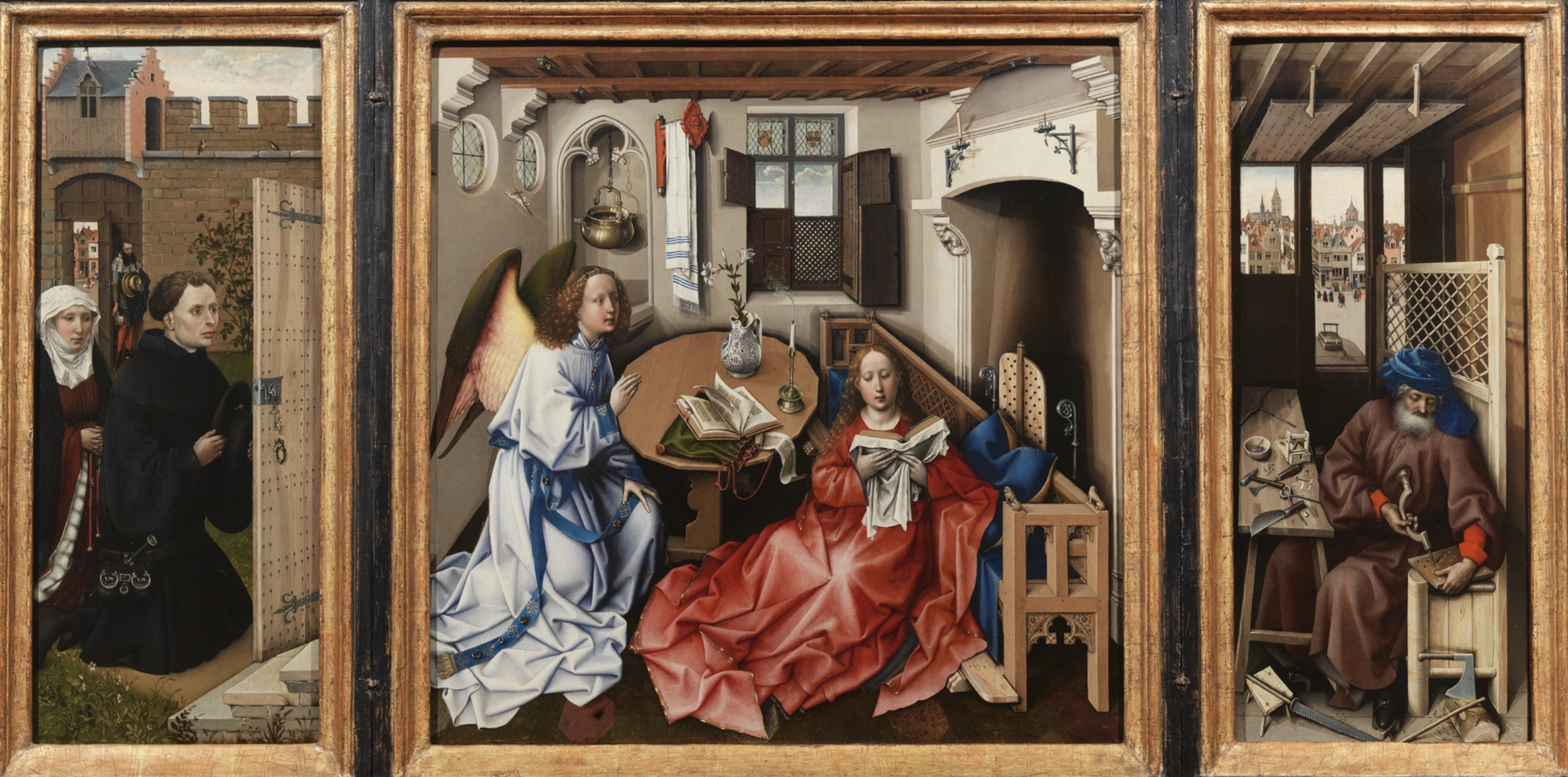 The style of depiction makes it seem that we viewers “are observing a real event, as if we had broken in on it somehow” (p. 355) The sower and the ploughman are engaged in characteristic ordinary activities, with no figure seeming to carry a higher meaning. In comparison with earlier European depictions, which typically gave indications of “what one should know, fear, understand, or hope for”, here and thereafter “painting served simply to show what there was to see” (p. 356). Analogism has given way to naturalism. In the early fifteenth-century Flemish painting of Roger Campin the concern for realistic rendering and precision of the depiction material details enters into religious painting, spectacularly so in the Merode Triptych with the grain of the wood and the folds of the fabrics (p. 375).