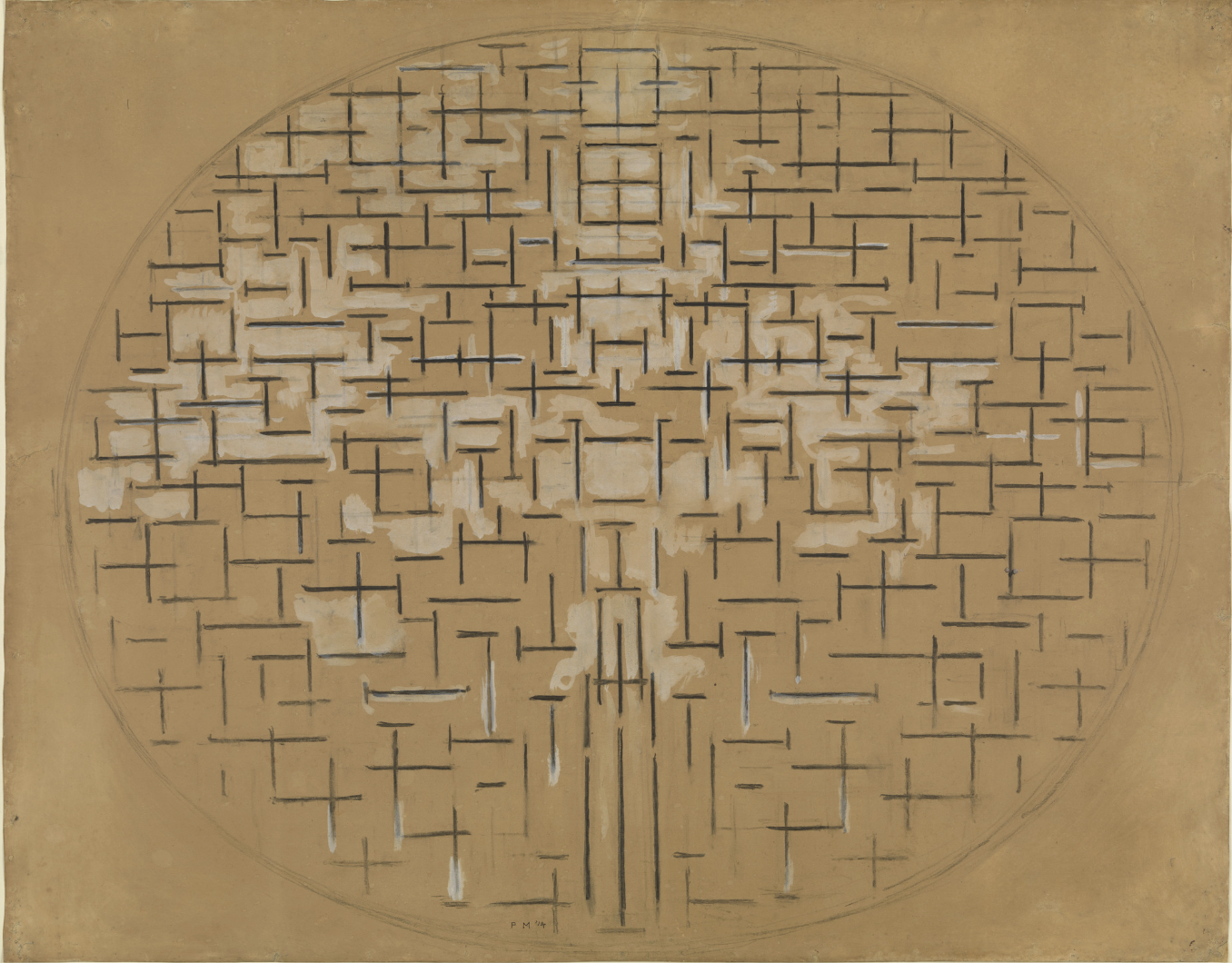 with the depiction reduced to short lines set in an oval, and the sensation of depth, expanse, and swell is given primarily through the play among small-scale crossings, the vertical thrust of the jetty at the bottom, and the oval frame.