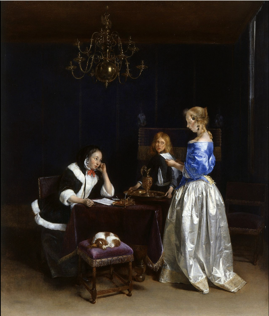 The Dutch painting of the seventeenth-century Golden age largely ignores the Italian manner of conceptualization and instead flows directly from the Flemish achievement: “Just like the painting of the Flemish masters two centuries earlier, that of the Golden Age makes manifest the attention paid to the surface of existents and the desire to represent their diversity through a homogeneous iconic treatment.” (p. 400) The conceptualizations and procedures of Dutch painting involve “the empirical and temporary slicing out of a phenomenon observed from the best angle”. In comparison with the Italians, this ‘dilutes’ “the hold of an organizing agent” in favor of rendering in a manner that seems to provide the very “self-evidence of the visual experience” and with it “a restoration of mystery to everyday life”. (p. 408) One immediately thinks of the mysterious interiorities of the figures in Vermeer, while Descola cites examples from Pieter de Hooch and especially Gerard ter Borch’s The Letter (1660-1665) (pp. 411-12):